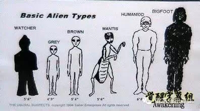 人类已知的50类外星人 美国官方科学家于2008年,在第一次国际星际政治揭秘工程发表会上正式宣布,到1989年为止,美国官方正式记录在册并分类的就有57种外星人。而现在,有正式目击记载的已经有200多种外星人。 有许许多多智慧生命。 有人型的,类人型的,也有非人型的.有的生活在另外空间,也有的生活在人这个物质空间的另外星球上.今天的现代人把光临地球的智能生命统称为“外星人”.其实它们中有的在最早期人类文明之前就到地球了,是地球上的原住民. 1. UMMITES(宇莫星人),来自Volf 424 Ummo星,距地球有14多光年远,于1950年来到地球法国南方山丘地区。宇莫行人跟我们地球人长相很相像,同属于人型外星人,一样有男性女性之分。他们的逻辑系统跟我们不一样,我们的逻辑系统是真,假,他们的则是:真,假,是真是假,不是真不是假。 宇莫星人的文字 2. Pleiadeans ,也就是我们经常听到的昂宿星人,又称七姐妹星人,他们不论精神方面及科技方面都要比我们地球人高很多。跟我们地球人一样,他们也属于人型外星人,也有男女之分。他们的寿命比我们人类要长,据说可以活到一千年(这里是换成我们地球的时间)。他们住在Taygeta(泰莱塔恒星)的Erra(依柔行星)星,他们和我们一样拥有相同的祖先----天琴星人。 跟昂宿星接触最多的是瑞士独臂农夫Billy Meier,他先后与昂宿星人Sfath(1942-1953年) 他们谈话内容很广,人类的来源,太阳系的成员,还有宗教,(昂宿星人他们没有宗教,宇宙中没有我们所信仰的神存在,我们所信仰的神耶和华是另外一种外星人),核能,地球人口过多等。 昂宿星距离地球440光年,器重最明亮的九颗星在七姐妹的希腊神话中都有名称:斯泰罗佩(Sterope),梅罗佩(Merope),伊莱克特拉(Electra),玛亚(Maia),泰莱塔(Taygeat),塞拉伊诺(Celaeno)和雅克安娜(Alcyone),还有他们的父亲擎天神阿特拉斯(Atlas)和母亲普勒俄涅(Pleione)。 3.LYRAN(天琴星人),据说地球人及其他人型外星人的起源就是天琴星人。地球上的白种人高大,皮肤,头发,眼睛的颜色都很淡跟天琴星人很像。当天琴星发生战争时,许多人躲避战争移到昂宿星,毕宿星以及织女星上。约5万多年前天琴星又发生战争,当时的领袖及其他36万人来地球避难,成为天琴星人最早来到地球的时间点。 4,YEGAN(织女星人),他们于天琴星战后属于相当和平温和的人,他们现在居住于昂宿星,Volf 424 及其他地方,他们是战争后难民的后裔。 5.GREYS(小灰人),体型小,被新创造类似蜥蜴人的种族。身高3.5-4.5英尺(一英尺约合0.3米)。皮肤颜色有白色,灰色,白灰色,灰蓝色,灰绿色。无性别区分,没有生殖器。残忍没有同情心,他们是最常见的外星人种类。他们跟美国有秘密合作的关系,美国得到飞碟及其他武器的技术,GERYS得到资源&能源&复制GREYS的基地,在地球上,他们通过基地内的实验室培育其他的GREYS。 他们有3大类,他们来自距地球39光年的外猎户座Zeta Reticulan星系附近。 TYPE A:这是最常见的一个类型,他们来自伯纳星(猎户座邻近的Zeta Reticulan星系) 他们社会结构很严谨像是个军事单位机构,他们头大,眼睛大,简单消化系统,没有头发,没有生殖器,正常身高约4.5英尺。他们似乎是无情残忍的,这些GREYS服务于爬虫类外星人,他们在新墨西哥和内华达州有基地,于其他国家也有。他们的星球一天90个小时,一年432天。 TYPE B:来自猎户座的高GREYS(高的小灰人)。他们身高较高,有7-8英尺。他们有着大鼻子,他们比较会用政治影响力去达到某些谈判结果,他们在阿留申群岛有基地。 TYPE C:他们身高是三种GREYS中最矮的,约3.5英尺,他们面部特征和TPYE A相似,他们是最敌视人类的一种,他们来自猎户座的Bellatrax星. 6. GREENS or OLIYERIAN (绿人)。他们有着正常人类的大小,但却拥有橄榄绿色的皮肤。据说他们来自欧洲地下洞穴的地方。 7.MOTHMEN(天蛾人or 蛾人),他们生活在地下,有着像蝙蝠般的大翅膀,也拥有角。根据遇过他们的人描述,他们很聪明也很有恶意。天蛾人除了吓人之外似乎很少有做过什么坏事的传说。他们在西维吉尼亚州及新墨西哥州被遇见过。 8.NEFIILIM or NEFILIM(拿非利人),他们曾经在圣经旧约中出现过,也是属于堕落天使的一族。他们是天使和地球人类妇女所生的混血种族,他们属于巨人族,身高约7-10英尺。 9.CYGNUSIAN(天鹅星人),他们属于两栖类的人,有着大且凸起的眼睛,宽大的嘴巴,没有头发,黑又油亮的皮肤,可能有着潮湿的外表。他们也属于银河联邦的成员,他们距离我们地球约1550光年,他们于53000年前频繁拜访雷姆利亚大陆(一个已经在地球上消失的大陆文明). 10.ANDROMEDANS(仙女星系人),他们已经发展至没有形体的种族,年龄平均有2007岁,他们也是昂宿星人的领导人及人型外星人的最后演化目标。他们也是个古老的种族,他们很担心我们的未来。他们说我们于2012年12月开始从第3密度提升至第4密度,中间过程要持续2-3年左右。他们也正在帮助我们银河系人的成长,如同昂宿星人帮助我们地球人成长一样。 11.DRACO(天龙星人)他们是爬虫类外星人。属于“皇室统治阶层”。他们外观与其他外星人不同,天龙星人有翅膀,一般而言他们有7-12英尺高。而且他们层级制度是依照他们皮肤颜色来区分的,白色皮肤的天龙星人是最高级的。 据说天龙星人精通遗传学,且他们存在这个宇宙数十亿年了,他们也创造了数个种族,也因为这样他们天龙星人也想当这些“被造物”的神,面对这些