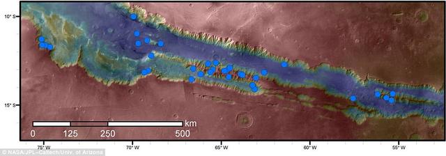 最新发布的研究报告列举了水手号峡谷中部及东部共41个RSL地点的详细观测数据,每个地点的线条从几个到上千个不等
