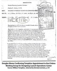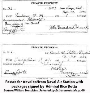 汤普金斯提供的文件证实,海军航空站的确允许他以“海军飞机的研究信息的传播者”的形式去派发“包裹”。从他的《外星人选定》(P58)可以很明显地看出,他从1943年春开始向道格拉斯飞机公司提供简报“包裹”。 他说,几年后,从1950年开始他来到道格拉斯飞机公司工作,并被迅速招入他们的秘密智囊团,但是人们并未意识到,那些先进的设计其实就源自他从海军秘密间谍计划搞来的纳粹德国情报。然而在1942年,由于美国国家安全形势的复杂性,直到战争结束前,对于回收反重力飞船的研究,并发展相关科技所投入的资源明显不足。据泄露的MAJESTIC文件显示,罗斯福总统听取军事幕僚的意见后得出的结论是,对反重力回收物反向工程的研究成果,想要短时间内能对战事起到帮助作用,显然太具挑战性。