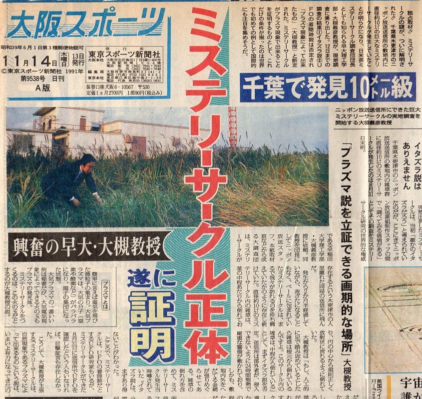 那天早上,警备员地基内的杂草,直径10米的Ciecle发现的。早稻田大学的理工学部大槻义彦教授,S . P .感知的异常顺便“等离子电流原因。”和大阪体育报的吉泽记者说了。 (照片) - 2 另一方面,千叶市居住的研究家藤平浩一先生在1991年11月14日现场访问了。并且2个半月过去的杂草的倒伏状态调查了。那杂草的湾曲,同样的时候石川县七尾市的杂草地出来了Mystery Ciecle类似的事确认了。(照片)3 另外警报的铃声一小时7次响了S . P .(照片- 4) 关于Nippon放送技术部的岸本氏听取了。岸本先生「S .大概一个月就只有几回”“这个装置是1970年设置的,但这是第一次”“警报5分钟的间隔就响了”。那之后,间隔就开了。