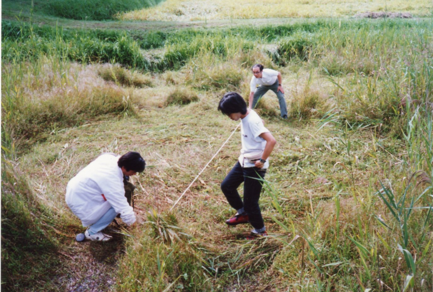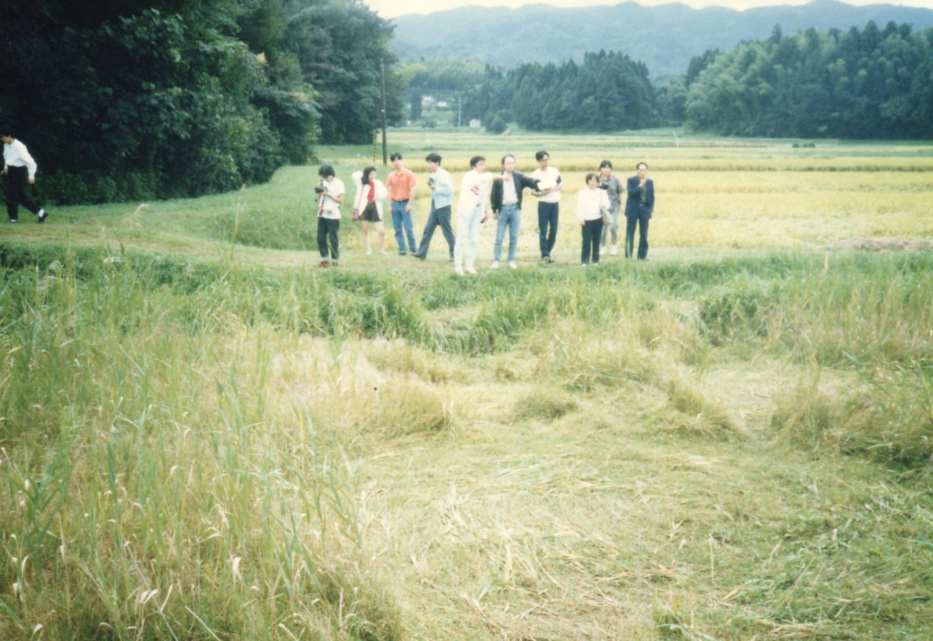 大阪UFOサークルは“UFOの町”として有名になった石川県羽咋市を訪れるツアーを企画しました。OUCではマイクロバスをチャーターして、大型免許を持つ乾達也氏が運転して羽咋市に向かうことになりました。参加者は大人と子供を合わせて17名です。私の娘天宮志麻(19才)も参加しました。 “UFOによる村興し”によって政府支援を得て羽咋市をUFOの町にした公務員高野誠鮮氏が案内してくれることになりました。これは気多大社における記念写真です。(写真-5) 1991年9月14日午後11時、私達は集合場所の新大阪駅を出発しました。バスの車内では、私が制作した『映像版UFO RESEARCHER』を上映しました。参加者はバスの中で行われた「UFO講座」を熱心に鑑賞しました。 私たちが乗ったバスは、9月15日朝、羽咋市に到着しました。そして高野誠鮮氏が乗り込みました。高野氏は国際的なUFO研究家です。彼は最新のUFO国際氏情報について解説しました。そして羽咋市の歴史や名所などを解説しました。そしてさらに「最近、七尾市にMystery Ciecleが発生しました。発生したのは9月1日頃です。この出来事は「北國新聞」9月3日に掲載されました。(写真-6)新聞記者は植物サンプルを採取しました。またCiecle出現の頃、付近の小学生が鉛筆のような形をした光る物体を目撃しました」と教えてくれました。 その事によって、我々のバスは七尾市に向かいました。バスは七尾市千野町にある休耕田に到着しました。この土地の所有者は会社員谷田秀光氏(46才)で、国道159号に近い約270平方mの休耕田です。発生したCiecleは大小合わせて3個です。参加者はCiecleを眺めて、雑草が不思議な湾曲を描いて倒れている異常な光景を見学しました。(写真-7) 私と高野誠鮮氏そして東力康純氏はCiecleの中に入って、巻尺による測定、磁石の反応、サンプルの採取を行いました。(写真-8) 我々が測定した結果、最大のCiecleは直径4.8m、その次の大きさは直径3.6m、一番小さいCiecleが直径1.5mでした。さらに我々は、完成途中のCiecleを発見しました。この特殊な状態は兵庫県稲美町の麦畑でも発見されました。 それは植物が渦状に曲がって円形を形成している状態です。 さて、最も大きいCiecleは、発生から2週間が経過しているのに、その細かい造作が美しいものでした。その中心部は極めて緻密でした。それは植物が細い草なので、その細い葉が渦を巻き、一種の芸術品にような景観を見せていました。私はこれを間近に見て感動しました。私は1961年に読んだGeorge Hunt Williamsonの著書『宇宙語?宇宙人』に言及された「回転磁場」を連想しました。 私達3人の測定や調査活動は、参加者によって撮影やビデオカメラによる記録が行われました。この写真の手前いるのが私の娘の天宮志麻です。娘はビデオカメラを操作しています。 |