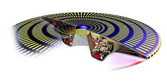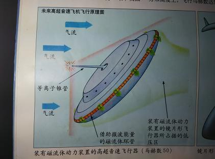 美国纽约的温斯勒工学院提出的一种空天飞机方案可算是真正的“飞碟”飞行器。当这种像凸透镜片形状的飞行器以M25的高超音速飞行时,它的凸起弧面朝向前方,因为圆钝的前端有利于突破“热障”。为了减少阻力,它的圆心伸出一个细长的等离子锥管,用来激发等离子体和产生斜激波,使“飞碟”躲在激波锥后方稀薄的空气区里,承受的阻力只相当于M3时的情况,并且激波带走大部分的热量,使“飞碟”免于受到烧蚀。而当它飞行速度减慢时,“飞碟”逐渐改成水平姿态飞行,让它的边缘朝向前方,可以产生更高的升力。同时,它的等离子锥管也相应地向机体内收入,而“飞碟”使用的磁流体动力“等离子体”推进系统,可以迅速地加速周围的空气,推动它前进。它周围的等离子体在加速时放出眩目的光芒,并且“飞碟”