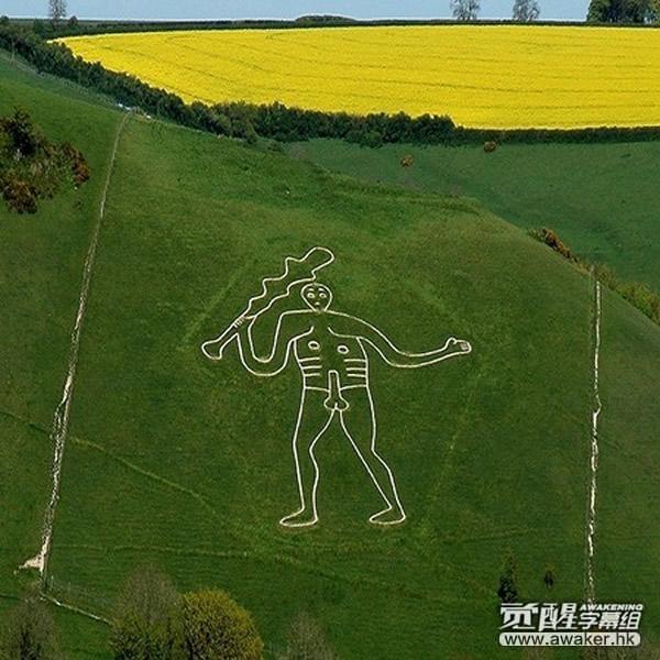 英国多塞特郡赛恩阿巴斯小村(Cerne Abbas)附近的山丘上,有个令男性一看就觉得羞愧的「赛恩野蛮人」(The Rude Man of Cerne)雕刻:翠绿草地上浮现一名全裸的白色巨人,它的右手拿着木棒、胯下竖起另一根「巨棒」。尽管画面不雅,这个雕刻仍成为英国唯一能够印制在明信片上的生殖器主题。