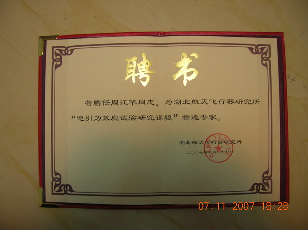 | 2005年吉林科学技术出版社出版了周江华的专著《21世纪物理学研究新视野》。2007年科技日报大篇幅的进行了连载报道《21世纪物理学研究新视野》书概要,报道引起了当时任三江航天集团党委书记刘石泉的关注(现任中国航天科工集团副总经理),并给周江华颁发了聘书,2010年周江华对放电飞行器飞碟的深入研究引起了中央电视台的关注,并在央视报道播出 ,周江华飞碟研究成型是在2013年,现在周江华正在对大功率放电飞行器进行研究,向放电飞行器实际应用推进,现在他正寻求有识之士的电容方面研究专长人才、科研单位、财团、天使投资的合作研发!