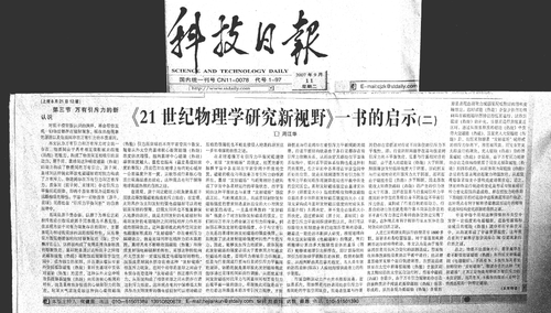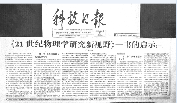 科技日报《21世纪物理学研究新视野》专著概要连载报道! 引起中央委员刘石泉的关注(中国航天科工集团副总经理)!