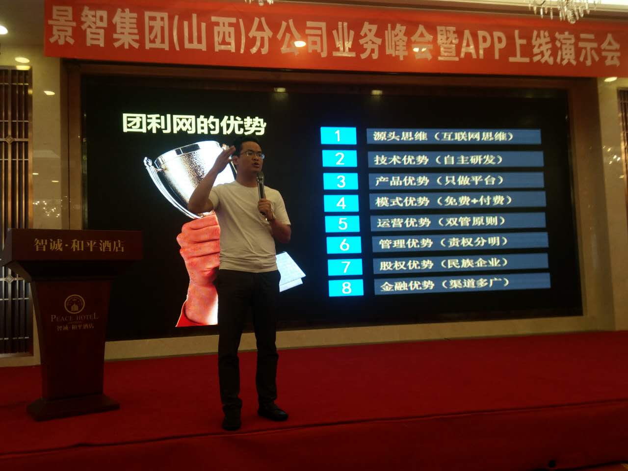 | 【短讯】6月4日,世界华人UFO联合会执行委员会副会长、山西分会会长苏丛柏和山西分会秘书长張连順,应邀请参加景智网络科技股份有限公司的“团利网”山西分公司,在太原智诚和平酒店举办的业务峰会(暨APP上线演示会)。 在业务峰会上,较全面了解到,随着互联网时代的到来,媒体、电商逐渐进入碎片化时代,无论是门户、搜索还是社交媒体、自媒体、公众号、占据的都是受众碎片化时间,精准营销应用而生。团利网已经形成成熟稳定的传播方法和规范的运营模式。 在会议中双方嘉宾进行友好会见。景智集团董事长赵景智、景智集团总裁王成坤、网络科技部张正、团利网山西分会经理張飞鵬,与苏丛柏副会长进行友好深入的交流。苏丛柏首先对召开会议表示祝贺并就双方合作共建共享,协同发展发表了如何在大数据背景下图媒新未来。并简约将世界华人UFO理事扩大会议盛况进行说明。赵景智董事长表示,世界经济仍然面临许多重大挑战,我们在区域经济合作、培育新功能、科技创新、绿色经济等要与企业家、经济家、科学家进行广泛合作,求解未来可持续发展之道。双方就合作框架意向达成一致。(山西分会—张连顺撰稿)