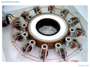 在验证旋转磁场系统中的非线性效应时出现了极其有趣的东西。这种效应在所谓的瑟尔发电机SEGSearl Effect Generator -瑟尔发电机)被观察到一台SEG是由三个环和围绕这些环的一系列的辊组成的。SEG所有的部分是依据幻方定律组成的。辊筒绕着组成了环的盘旋转,但与它们并不接触。辊筒上有一个基本的和北极,盘上也有一个基本的南极和北极。显然,你可以用辊筒的北极去吸引盘的南极。盘子和辊筒均为层状结构。外部层——钛、然后是铁、尼龙、内里的最后一层是钕。约翰RR瑟尔猜想由中心元件(钕)释放出电子,而它们穿过其它元件向外传播。如果没有安放尼龙,SEG就会像一道激光和一个脉冲的发射并停止、累积,然后另一个脉冲发出。但由于有尼龙在,尼龙起了一个控制门(控制栅极)的作用,而那个控制门给了你一个遍及整个SEG的均衡的电子流盘和辊的的磁化过程中,恒常和变化磁场结合用于在盘和辊的表面产生一个特殊波 (正弦波) 的模式。基本效应是辊筒绕着环形盘自运行,而重量的减轻达到了推进的发生和整个磁系统的向上飞升。这些效应是由于实验设备的特殊几何结构而的发生的。显示出装置运行的关键动态中伴随有生物的和物理的现象。遗憾的是,除了列出的参考,我们对这台实验设备再也找不到其它的类似所述效应的信息。