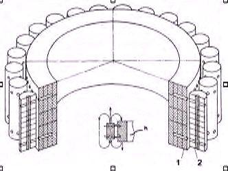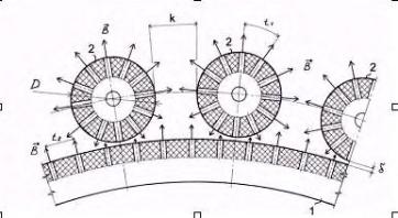 基本的难点是选择材料并维持必要的模式印迹在盘和辊筒面上。为了简化工艺技术,我们决定用只有单环盘(定子) 和单环辊(转子)的单环设计。很明显,有必要通过承座加强转子上的滚辊并平衡好滚辊。在建议的设计中使用了空气轴承,使得摩擦损失最小。从可得到的描述[1-4]中,尚不清楚它是如何能造成定子有一个约一米直径的磁化。为了使定子从各自的在稀土磁体的基础上的磁化节实现具有1个特斯拉的剩余磁感应;这些节的磁化是以一个通常的方式,通过放电电容电池通过线圈的进行的。之后这些节被组装和粘结在一起,成为一个特殊的减低磁能的铁支架。制造定子用了110公斤的稀土磁体,而制造转子用了115公斤的这种材料。没有用到磁化强度下的高频场。这确定了取代[1--4]所述的印迹技术的是以交叉磁镶嵌件,具有与定子和转子的辊筒群的基本磁化向量成90度的定向的通量向量。对这些交叉镶嵌件,用的改性稀土磁体具有12特斯拉的剩余磁化强度,而抗磁力则略大于母材。图1和图2中,显示了定子1的接合处的配置,和转子元件——辊筒2通过交叉磁镶嵌件19的互相传动的方式。定子和辊筒表面之间留有1毫米的空隙。