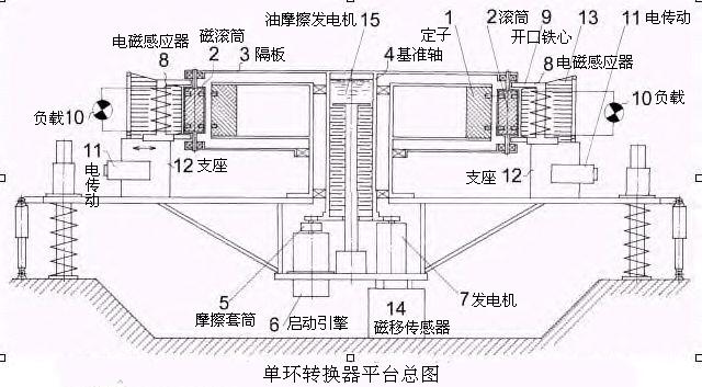 定子1安装为静止的, 而滚筒2组合安装在一个与设备的基准轴4连接的、并通过该轴传输旋转力矩的、可迅速转动的公共的隔板3上。基准轴通过摩擦套筒5的手段连接到电动力学发电机7和启动引擎6,启动引擎使转换器加速以达到自持旋转的模式,顺着转子安放的是带有开口铁心9的电磁感应器8。磁滚筒2与感应器的开口铁心交错并关闭磁通穿过电磁感应器8,并引起电动势,并直接对有源负载10(一组总功率1千瓦的白炽灯)作功。电磁感应器8 配备了电动传动11,并有机会在支座12上平滑移动。为了研究外部高压对转换器规格参数的影响,安装了径向电子极化系统。在转子环外缘上的电极13被设在电磁感应器8之间,电感器与滚筒2有着10毫米的空隙。电极连接到一个高压源;正势连接到定子,而负的则到极化电极。电压在020千伏内调节。在实验中使用的常量值是20千伏。万一紧急制动,普通汽车的摩擦片被安装在一个转子的基准轴上。电动力学发电机 7 通过一组开关连接到有源负载,确保负载从110千瓦的级式连接。 转换器在测试中有自己的内部构造的热能的油摩擦发电机15,是为开发剩余能(多于10千瓦)进入等位线内。但由于实验中转换器的实际输出功率未超过7 千瓦,油摩擦热发电机并未用到。转子旋转的完整稳定性是通过电磁感应器连接到一个附加负载来施行的,那是一组功率1千瓦的白炽灯。