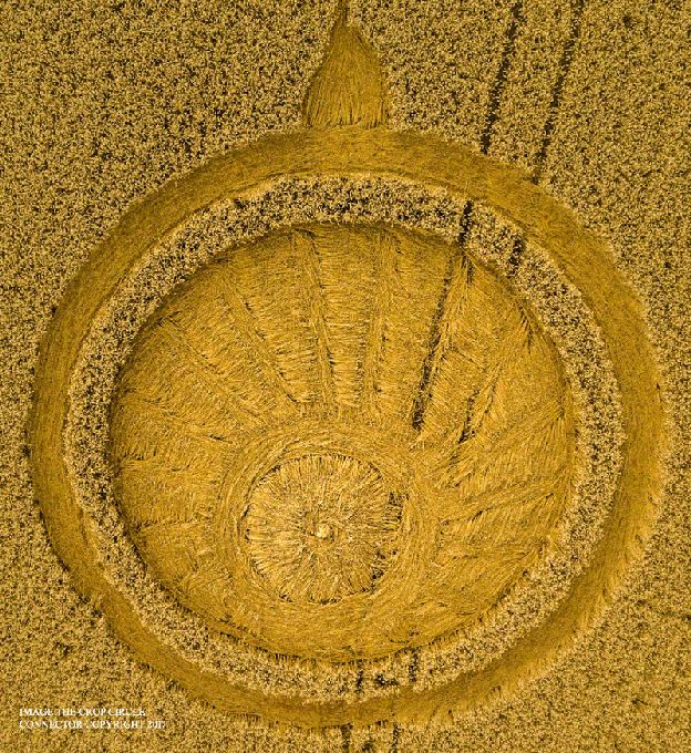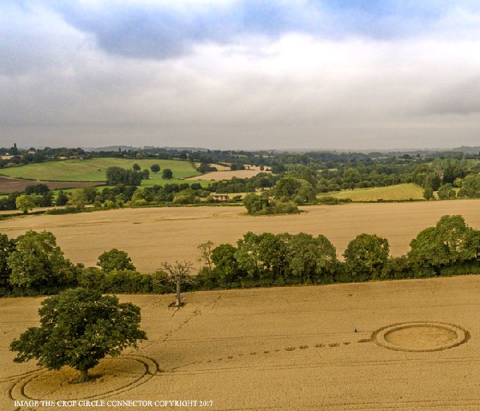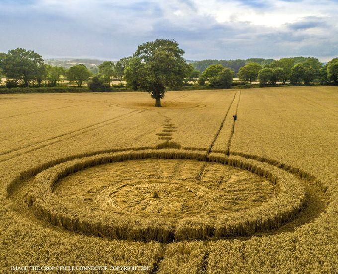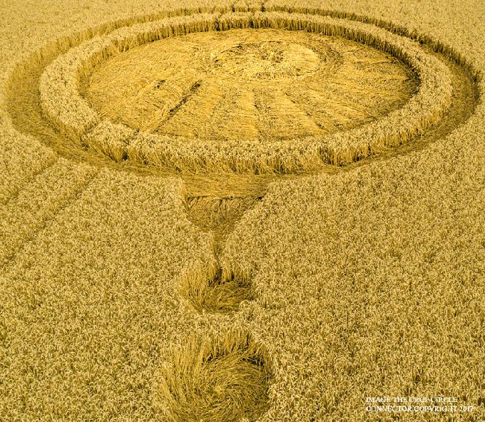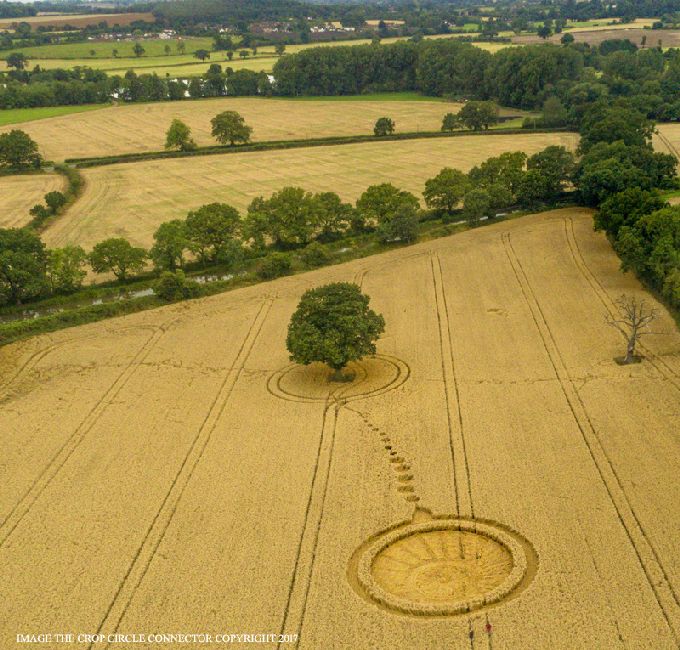 2017年8月7日 Nr Wooton Wawen 沃里克 (本文内有耿兆良的联想式解析) Monarch's Way, Nr Wooton Wawen, Warwickshire. Reported 7th August. Map Ref: SP1641163494 耿兆良的联想式解析: 20170807出现的这个麦田圈的主圈(上图),象征咱们地球。由于核暴炸至使地球近乎毁灭,麦田圈里明显示意了核爆炸的蘑菇云,而其向四周辐射情况也沥沥在目,甚至导致地球磁场也撕裂出去。 原注:Could this crop formation relate to the Eclipse in the USA on the the 21st of August? 这种作物的形成与八月二十一日美国的日食有关吗?