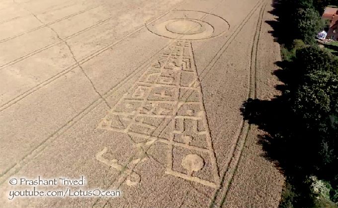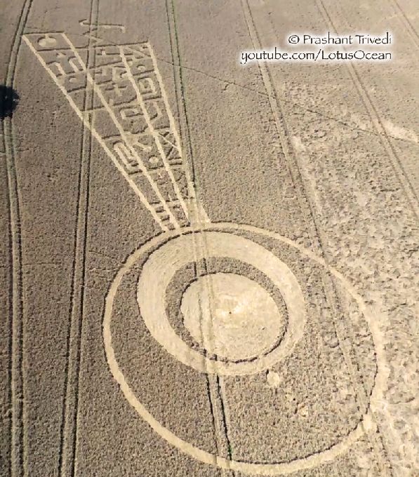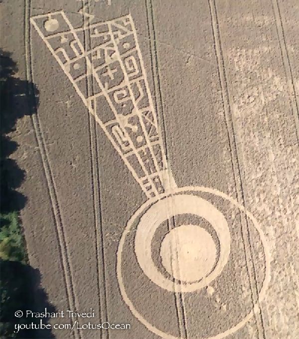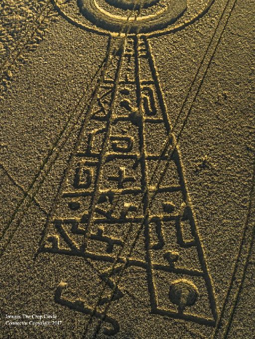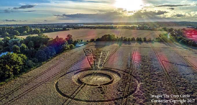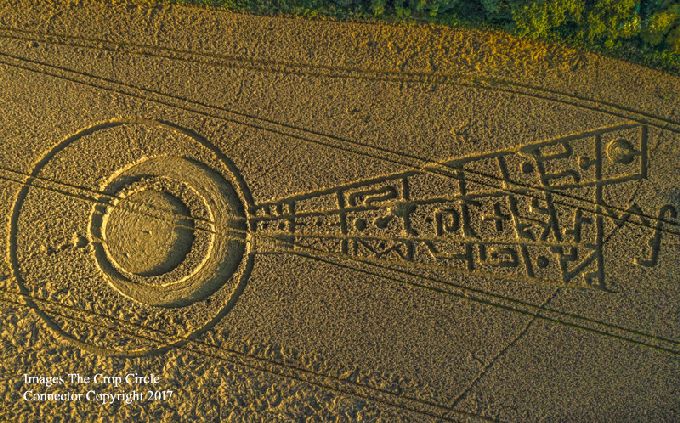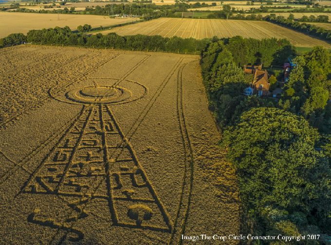 2017年8月17日英国埃塞克斯 Sutton Hall 发布时间: 2017-08-19 Sutton Hall, Nr Rochford, Essex. Reported 17th August. Map Ref: TQ8891589275 Important Notice to drone pilots: As this crop circle is so near to Southend Aiport it is essential to contact Southend airport air traffic control tower to get permission as to when and how high you can fly. They are very friendly and helpful but clearance is essential! Telephone number: 01702-538420 这个麦田圈离绍森德(Southend)机场很近,研究人员提醒如果无人机拍摄一定要跟空管员取得联系。 注:约有20个字符,最后一个似是签名。目前还没有对应的字符破解。