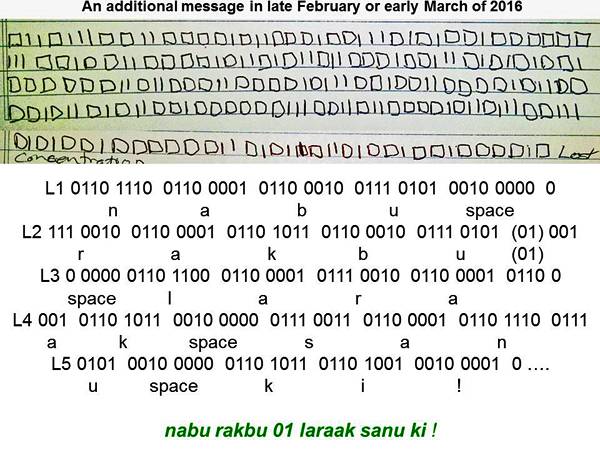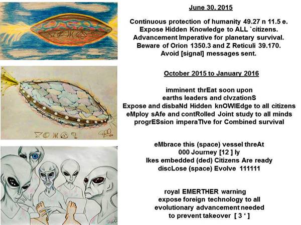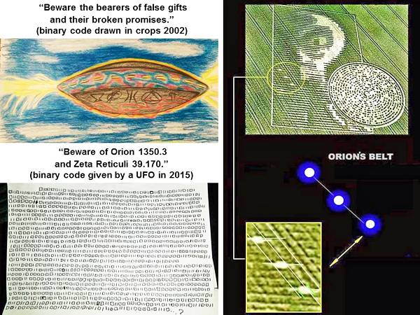 转载自:阿良 麦田怪圈 并不代表本博客观点 2017年8月17日,在英国埃塞克斯郡罗奇福德出现了麦田圈,寓意着不平凡的事,即将发生。 Sutton Hall, Nr Rochford, Essex. Reported 17th August. 需要破解2017年8月17日麦田怪圈传递的信息,大家请耐心阅读下文: 外星人的预警信息:负面外星人准备接管地球 人类须加速发展 我简单叙述下。2015年6月29日凌晨,一只大型UFO的集合体或舰队在美国亚特兰大和美国东南部的大部分地区飞行。他们被大规模目击,并在美国宇航局的流星相机拍摄到。 2015年6月28日,晚8点30分,陆军中士CJ和他的家人离开了乔治亚州里士满山的亨特陆军机场。这家人正搬到CJ在科罗拉多州斯普林斯附近的新岗位。6月29日凌晨1:20,他们在韦德格鲁吉亚,目击了一艘巨大的UFO,这艘UFO大约有250米长,50米高,距离地面60米。大概观察了10来分钟,并隐隐约约看见几个外星人在地面活动。 6月30日5点,他们开车到帕德尤卡,住宿到一家汽车旅馆。 CJ在浴室里恍惚醒来。他发现,在汽车旅馆的全页收据背面,他无意识地写下由左到右的线条和方块组成的符号。见下图: 正方形和线条,代表1和0,实际上是二进制代码,由CJ在一个Motel 6 收据的背面书写。 用二进制代码编写,可以通过标准的ASCII表进行翻译。科学家对该信息翻译如下: Continuous protection of humanit y 49.27 n 11.5 e 持续保护人类 49.27n,11.5 e (德国纽伦堡市的坐标) Expose Hidden Knowledge to ALL citizens 向所有的公民揭露隐藏的知识 Advancement Im perative for planetary survival 提高行星生存的必要性 Beware of Orion 1350.3 and Z Ruticuli 39.170 小心 猎户座 1350.3光年 和 泽塔? (Z Ruticuli)39.170光年 Avoid [signal] messages sent 避免信号发送的消息 上图中,大家注意到左上UFO身上有奇怪的文字,类似古埃及或者苏美尔文字。这是CJ在催眠下后回忆起来的。当时,他短暂和外星人有过“接触”,并目睹了UFO身上的文字。 而这些文字和英国著名的蓝道申森林事件,飞喋上的符号,非常相似。 蓝道申森林事件(英语:Rendlesham Forest Incident)英国萨福克郡蓝道申森林1980年发生的UFO事件。1980年12月的一个凌晨,在英国伍德布里奇—文特沃塔斯空军基地附近的蓝道申森林里,发生了一件不同寻常的事情。一只外星种族的UFO在此降落,并被多名士兵目睹。士兵们获取了大量现场的证物,包括照片、现场笔记、现场录音、飞船压痕的模型。 其中飞碟上的图案也被回忆并被记录。见上图。 有科学家判断,蓝道申森林事件中UFO和CJ军士遭遇的是相同种族的外星人。并且蓝道申森林事件的当事人,事后也被外星人持续联络,通过心灵感应的方式,传递过二进制信息。 回到2015年CJ军士遭遇事件,外星人随后几年,再次通过心灵感应传递过几次二进制图案。被翻译后如下: 第一条: 地球上的领导人和文明社会即将面临迫在眉睫的威胁,必须把所有隐藏的知识揭露出去,同时要安全、可控的联合研究。智力进步是共同生存的必要条件。 第二条: “拥抱(迎接)这艘太空船的威胁”,他们已经在“12光年外的空间中做了一个紧急的“000旅程”,也许来自鲸鱼座τ星)。“Ike(光电感应器)的嵌入式公民已经准备好了”, 第三条: 揭示了他们是谁:“皇家EMERTHER警告”。这些外星人称自己为“Emerther”,似乎这个警告来自他们文明的“皇室家族”。 每条消息也包含一系列“隐藏代码”,这些代码是由“大写与小写字母”指定的,或者在某些情况下由“删除”字母表示。 他们的第一个信息使用了异常大写或重读的字母来暗示“CHE ' ck ALL A.I.”(意为“人工智能”计算机)“ZORBA”(建议“希腊”或特洛伊木马病毒)。 第四条: 在2016年2月或3月被“CJ”接收的第五个二进制代码显示了“苏美尔语(闪族)”的简短信息。上面写着“nabu rakbu 01 laraak sanu ki ! 它是用“苏美尔语”写成的,它近似地翻译成:“先知信使01,看到明亮的辉光,告诉地球!” 这条信息及其重要,也就是8月17日麦田怪圈所要传递的信息。这条信息是写给先知信使01的,让他收到信号后告知人类。 从麦田怪圈的图案来看,大圆套小圆。 三个小圆点,逐渐逼近大的圆球,象似远方来的信息。随后明显有释放、辐射的含义,意思为明亮的辉光。而下面的文字,为需要释放的信息。 此照片的拍摄者,不知道是谁,看起来也明白它的含义。大家注意,这个季节的麦田里面,麦田呈现枯黄色,8月正是收割的季节。而天空压着一片乌云,有“山雨欲来风满楼”的意味。一道阳光照射下来,颇有拯救之意。 有时候意识会产生同步。外星人往往会假借合适的人,合适的方式传递信息。 这个麦田怪圈,到底是谁发送的,发送给谁,到底什么含义呢。如果看了上面的链接,大家都应该明白,是一支叫做,Emerthers种族的外星人发布的。而且这只外星人的母星距离地球大概10光年左右。 在2015年第一次接触CJ后,他们发送的信息中,有这么一句: Beware of Orion 1350.3 and Z Ruticuli 39.170 小心 猎户座 1350.3光年 和 泽塔? (Z Ruticuli)39.170光年 而此条信息指出要小心猎户座和泽塔星的灰人。此信息和2002年的麦田怪圈传递的信息几乎一致。其中的密码翻译如下: “你们要防备假礼品及他们破碎的承诺的承担者。有许多痛苦,但还来得及。相信。有很好的在那里。我们反对欺骗。管道关闭。承认这点。” 而这个麦田怪圈中提到的灰人,就是猎户座的。为什么这么说,看下图: 灰人的侧面,有三颗星星,它们是猎户座的