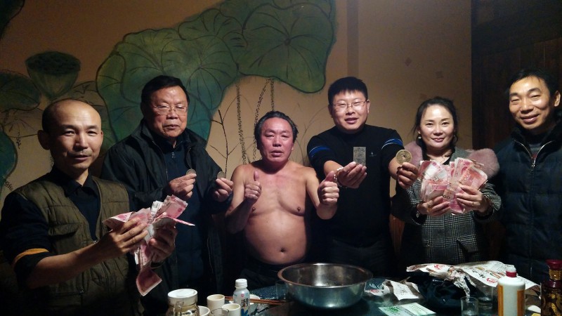 金帆会长(左2)、黄保国副主编(左1)与上海来宾,现场抓出的纪念品和钱币 黄毅董事长(右1)、杨德贵大师(左3)