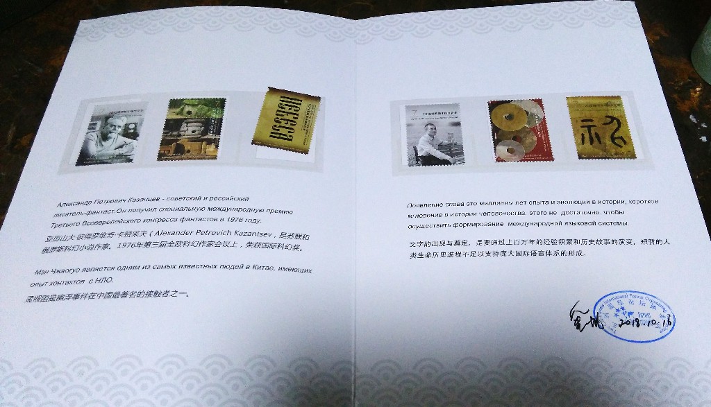 金帆会长(右1)为参观者签名世界首发UFO主题邮票纪念册