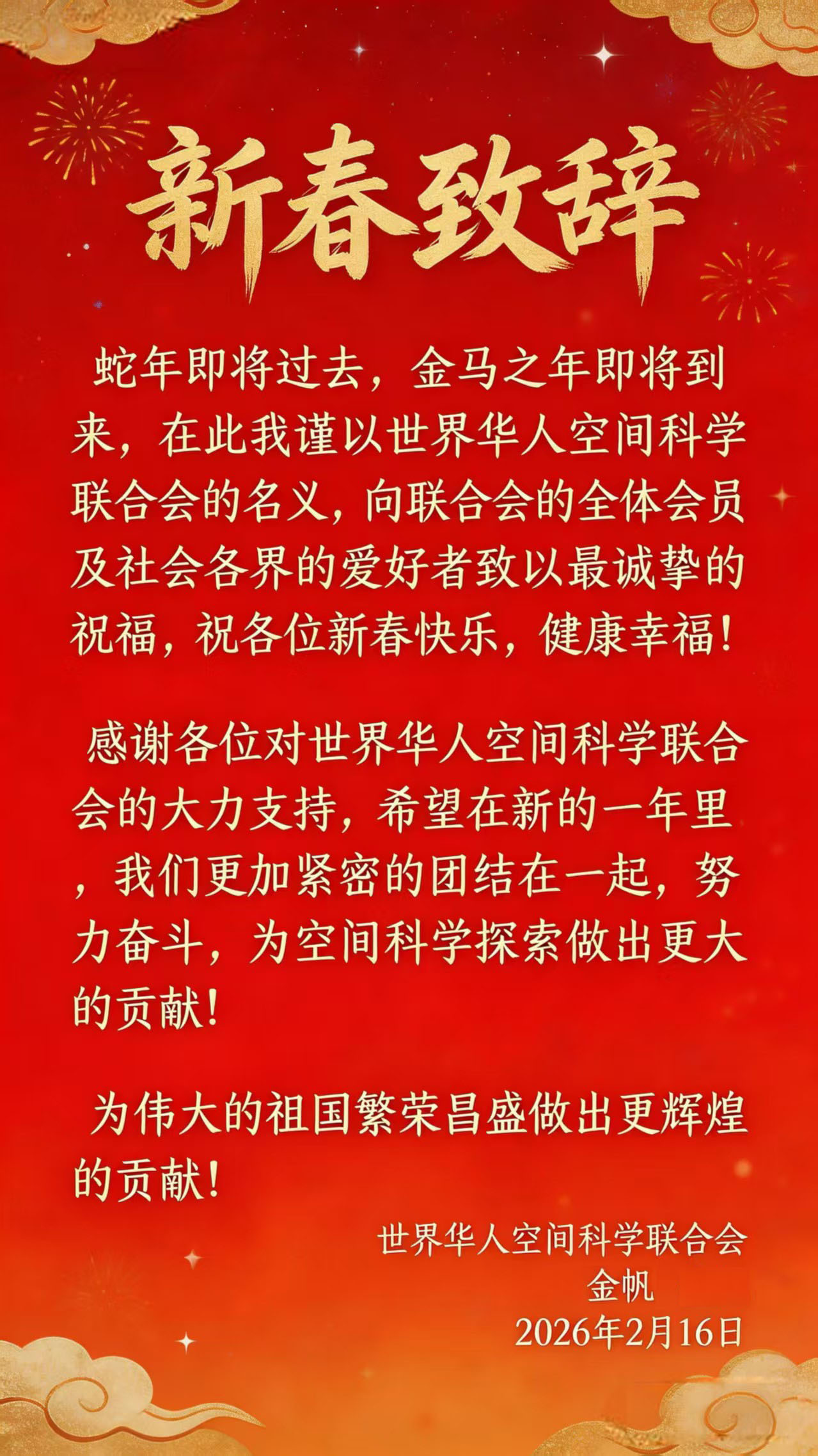 各位空间科学研究工作者、UFO爱好者、人体科学研究者们:大家好! 值此2026年春节除夕,我受金会长委托撰写此文向大家问候和新的一年祝福!回顾过去一年,以金会长为首的联合会多位成员进行了多项任务,比如,已经八十多岁高龄的金会长带领多位在中国UFO界比较资深的研究者撰写中国UFO发展史,杜振武、楼锦洪、杨安定、顾伟、王维刚、孙立营等人编写工作如火如荼进行中,发展史将以客观、写实的面貌展现过去40年中国UFO发展历史。金会长百忙中亲力亲为带领大会组委会成员于2025年10月5-7日在苏州成功地举办了空间科学大会,在多位热心人士捐助下,大会收支实现不亏,略有盈余,盈余部分将用作出版中国UFO发展史和协会执照年审,及网站运营方面的支出,在此我代表联合会感谢大家对空间科学联合会的支持! 过去一年中,各地研究学会成员热心参与空间科学和UFO研究,成立各种研究小组,有一些研究者把中国古代传统文化及人体生命科学相结合进行探索,还有以外星治疗等现象进行实证探索及其研究,其中以京津冀UOP研究中心的戴存兵部长为首,带领该中心各位成员,尤其张毅玮和于淼等多位老师工作突出,在古代医学和现代医学、外星医疗做了大量工作,还举办每周一次腾讯会议空中讲座。大连UFO学会一些会员对夜间UFO现象去伪存真的研究,李炜老师实地考察青海外星遗址、环渤海采访渤海空中亮光现象等多个地方,新疆UFO学会在理论探索甚丰,例如杜振武会长的文章在20年前引起美国同行关注,因政策原因没有与国外同行合作研发,时至今日杜会长的文章还具有一定跨时代研究指导性,杜会长时刻思考理论落地应用的事情。在理论与实践相结合方面,在年轻UFO研究者当中也有一些会员取得一些成绩,尤其是尚世群,他的理论通过第三方与军方合作,该研究已经有确定明显的反重力效应,还有不方便透露其姓名及其研究单位的研究者中也有在非空气动力学方面突破,该装置实现悬浮和高速飞行,这是可喜可贺的事情!这将鼓励一批又一批研究者更加热情高涨投入空间科学和UFO研究事业上。 在举办空间科学大会前,曾商讨联合会联合其他各地兄弟协会成立一带一路文化产业组委会事宜,为项目落地应用铺路,期间上海地区会员出了不少力。在上海期间探访X茶馆,金会长对创办人陈卢一先生秉承科学方法探索比较前沿领域做了不少实践工作给出高度评价。同时拜访上海UFO研究探索中心同仁,交流多方面意见。 联合会网站多年前在疫情期间暂停了,今年对其恢复工作,网站(http://wcssa.com)正式向大众开放,为大家提供空间科学、UFO现象和人体科学等信息。欢迎热心同仁参与网站建设和日常管理维护工作! 中国空间科学研究和UFO源头应该要追溯到大科学家钱学森,在美国期间,钱学森在MIT和SAG工作时,曾经参与对纳粹科学家审问,和对美国军方回收的失事外星飞碟进行过研究和“逆向工程”(reverse engineering),包括1947年罗斯维尔事件,回到国内参与研发导弹和原子弹,1957年,钱学森就提出了建设“星际航行学院”的构想,旨在培养贯通多学科的复合型人才,后期又提出研究人体科学,称人体科学是开放复杂巨系统。因法X功事件影响,人体科学研究一度走向低调进行,随着对国家科学研究支持,人体科学又逐渐热火起来,尤其是2026年1月27日上午,中国科学院大学星际航行学院揭牌仪式在中国科学院与“两弹一星”纪念馆举行,标志该学院正式成立。 未来10至20年,是我国星际航行领域跨越式发展的关键窗口期,原始创新基础研究和技术突破将重塑深空探索格局,深刻影响国家竞争力。成立星际航行学院,是中国科学院大学抢占科技制高点任务、布局星际航行领域人才培养的关键举措,将为国家深空探测、空间科学研究等战略需求提供人才支撑,这与联合会愿景一致。 我们承认在过去有做得不足之处,总结经验,尽力完善做好,再接再厉! 蛇年即将过去,金马之年即将到来,在此我谨以世界华人空间科学联合会的名义,向联合会的全体会员及社会各界的爱好者致以最诚挚的祝福,祝各位新春快乐,健康幸福!感谢各位对世界华人空间科学联合会的大力支持,希望在新的一年里,我们更加紧密的团结在一起,努力奋斗,为空间科学探索做出更大的贡献!为伟大的祖国繁荣昌盛做出更辉煌的贡献! 世界华人空间科学联合会 马泽明 2026年2月16日