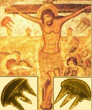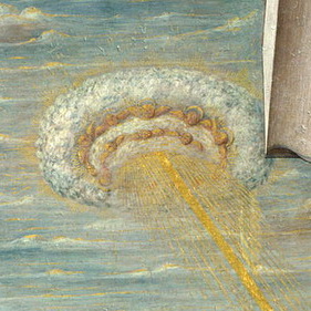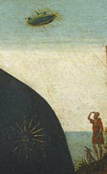 一、Annunciation with St. Emidius(天使报喜)(1486) 这幅《天使报喜》是Carlo Crivelli(1430-1495)在1486年创作的,现在收藏在英国伦敦国家画廊中。 画里局部细节放大图中一个磁盘状物体(UFO)发出光芒,且其中一束光照在了玛莉亚的头上 二、The Madonna and Saint Giovannino 这幅15世纪的画是一位不知名的画家所画的,在意大利佛罗伦萨旧宫之中。 画中玛莉亚的后部,右边有个人和一条狗,那人很明显在看空中一个椭圆形或盘状、黄金围绕周边的物体(UFO)。 三、在十字架刑法(The Crucifixion) 位于南斯拉夫科索沃Visoki Decani Monestary 的圣坛之上的壁画“在十字架刑法”绘于1350 年,壁画的左上角和右上角分别有个奇怪形状的物体。 这两个奇形怪状的物体似乎是个载人飞行器 四、基督受洗(The Baptism of Christ) 这幅“基督受洗”是荷兰画家阿尔特·德·杰尔德(Aert de Gelder,1645-1727)于1710年创作的。图中有一个明显的UFO。 五、在十字架刑法 这是17世纪的壁画,位于美国南部的乔治亚州的Svetishoveli Cathedralin Mtskheta。这幅壁画的左右上角都有不明飞行物。左右下角是不明飞行物的放大图。 |